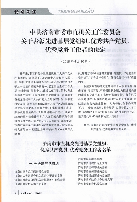 中共济南市委市直机关工作委员会于6月30日刊发《中共济南市委市直机关工作委员会关于表彰先进基层党组织、优秀共产党员、优秀党务工作者的决定》,我公司市场经营部副经理冯鹏同志获“优秀共产党员”、工会副主席高鹏同志获“优秀党务工作者”荣誉称号,公司党委号召向两位同志学习,望其充分发挥党员模范带头作用,谦虚谨慎,戒骄戒躁,为公司发展再立新功。